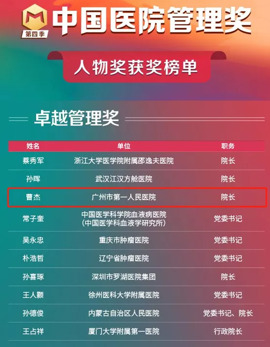 10月22日,第四季中国医院管理奖颁奖盛典在安徽合肥举行。广州市第一人民医院院长曹杰脱颖而出,获评全国十佳“卓越管理奖”。