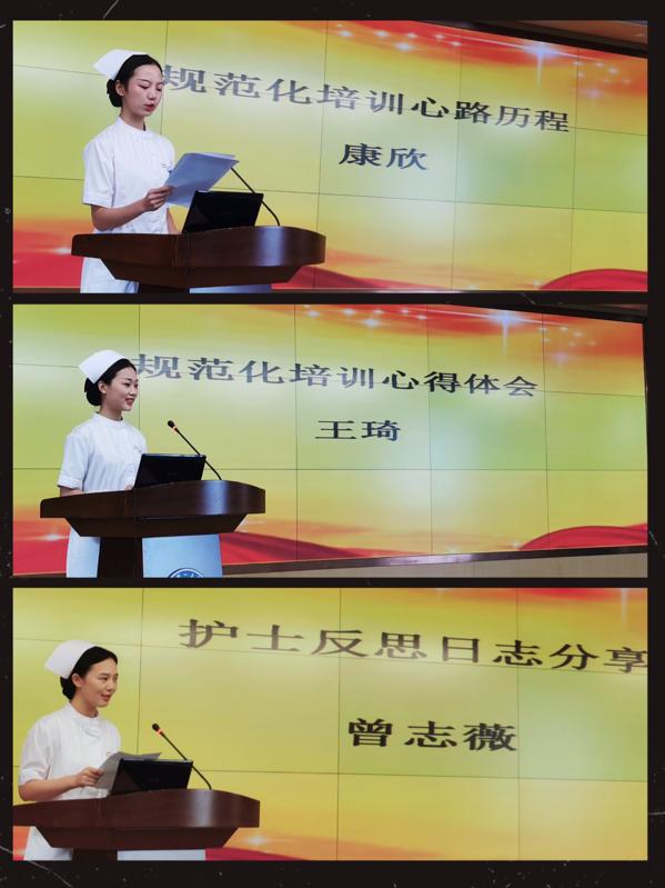 在2019年入职护士规范化培训结业环节上,护士代表曾志薇进行了优秀反思日志分享;护士代表康欣、王琦分别就规范化培训的心路历程和心得体会进行了发言。她们表示在护士规范化培训中的获益,不仅仅是工作上的,同时也是人生进入执业生涯中的一堂生动精彩的课程。