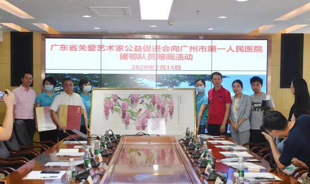 7月15日上午10时,广东省关爱艺术家公益促进会向广州市第一人民医院援鄂队员赠画活动在我院门诊八楼第一会议室召开。广东省关爱艺术家公益促进会主席何俊华等捐赠代表一行、广州二中教育集团广州市第二中学副校长李颖等广州市第二中学校友代表一行、广州市第一人民医院曹杰院长以及部分援鄂医疗队代表参加。活动由广州市第一人民医院余纳副院长主持。