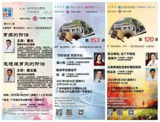 广州市第一人民医院盘福路总院内科一楼科普文化广场是我们的大本营,我们也经常“走出去”,讲堂进社区、进公园、进学校、进企业,分别联手广雅中学、广汽丰田、逢源社区、流花湖公园、广州图书馆、中山大讲堂等单位,为受众量身定制选题——给中学生讲解压和合理用药,给社区居民讲“二胎”,给公园市民讲中医,给企业职工讲甲状腺防治……将服务带到家门口,体现医院品牌公益性。同时联合媒体平台,为医院及医生增强品牌辐射力和影响力。