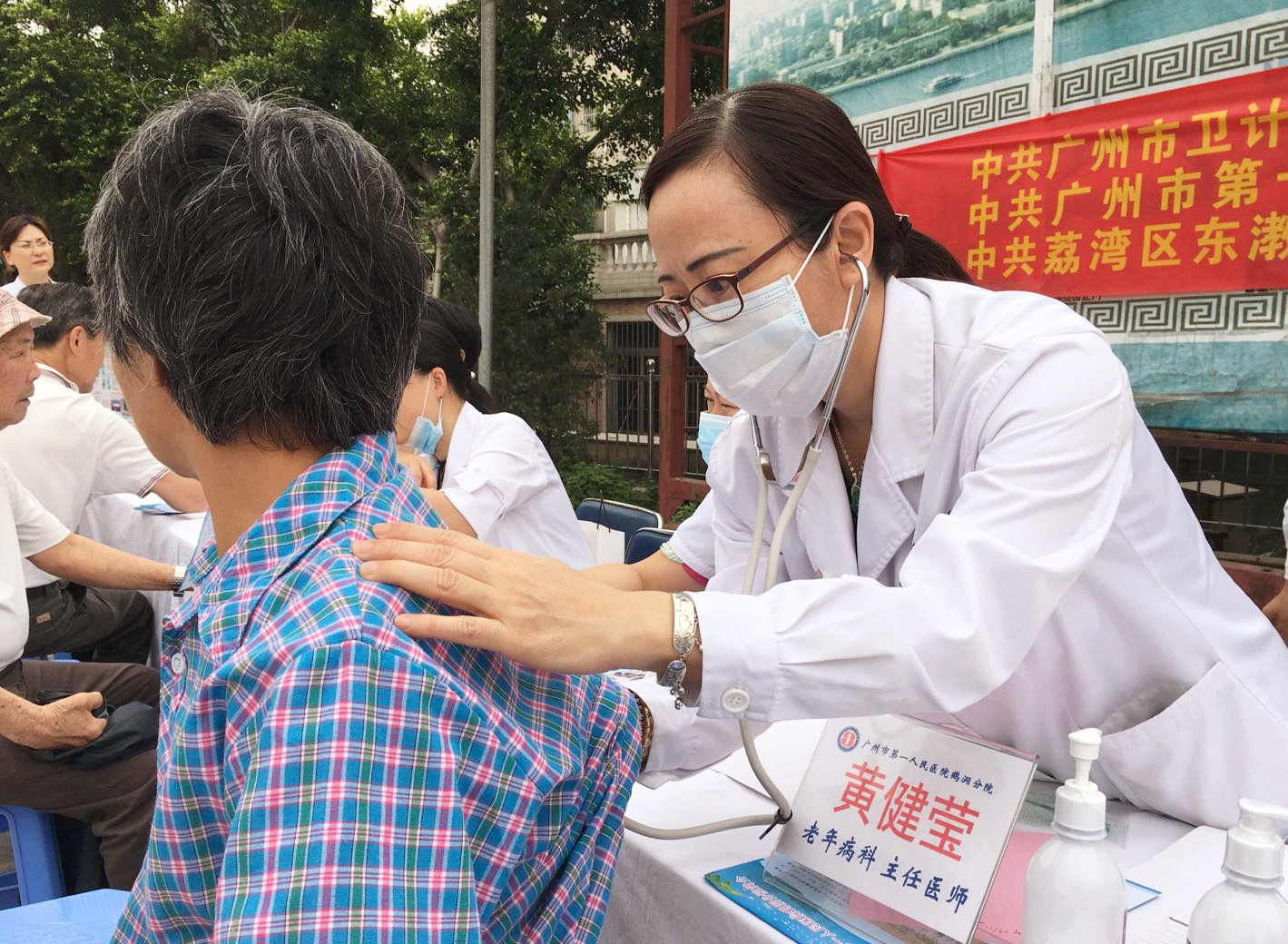 “您觉得哪里不舒服呀?”、“您的血压稍微有点偏高哦”......医护人员对前来咨询的居民进行一对一的检查及健康指导,现场为居民免费提供测量血压、血糖检查,得到了当地居民的热烈欢迎。