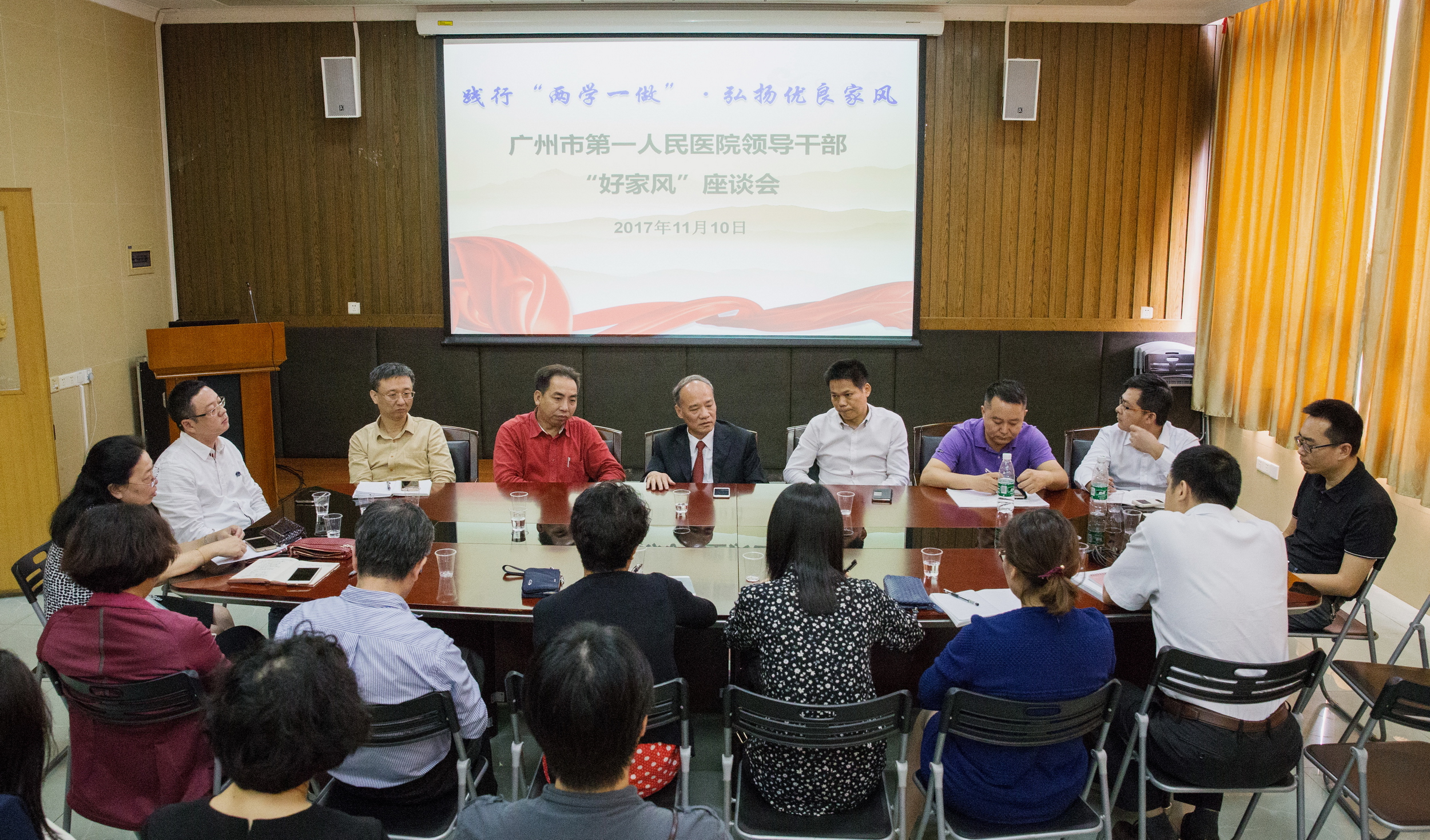 为深入贯彻落实习近平总书记关于“注重家庭、注重家教、注重家风”的重要讲话精神,推动“两学一做”学习教育常态化制度化,2017年11月10日上午,我院在影像楼6楼组织召开“践行两学一做·弘扬优良家风”家庭助廉座谈会,医院五级职员、副处级领导干部、部分支部书记、部门工会主席代表近三十人参加了座谈会,党委书记蒋少艾、南沙医院党总支书记黄逸辉参加座谈会。