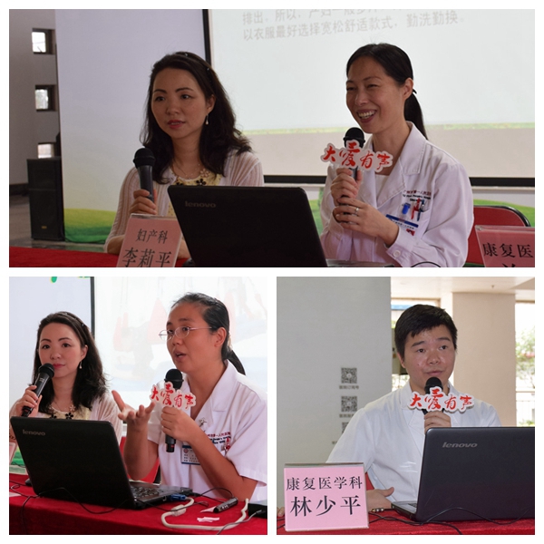 活动现场,康复科主任兰月为这次讲座做了一个精彩的开场,妇产科李莉平主任医师从衣食住行等方面解开“坐月子”的各种误区,告诉各位孕妈咪如何科学坐月子。康复科安莹主治医师详细地介绍了产后常见功能在障碍及如何进行相关的康复治疗。针对“妈妈手”,安莹推荐了支具保护、超声波治疗、局部中药熏蒸及手部训练操的康复方法。康复科林少平治疗师针对产后腰痛的案例,详解介绍了SET的治疗方法,能激活核心肌群,减轻骨盆前倾压力,并介绍了几组居家训练方法。