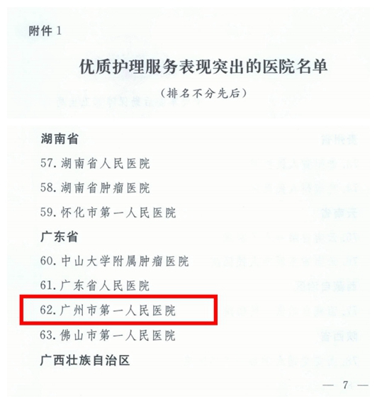 近日,国家卫生和计划生育委员会发布了《关于对优质护理服务工作中表现突出的集体和个人进行通报表扬的通知》,广州市第一人民医院获评国家卫计委“优质护理服务表现突出医院”荣誉称号。广东省仅四家医院获得此项荣誉,广州市第一人民医院是广州市上榜的市属医院。