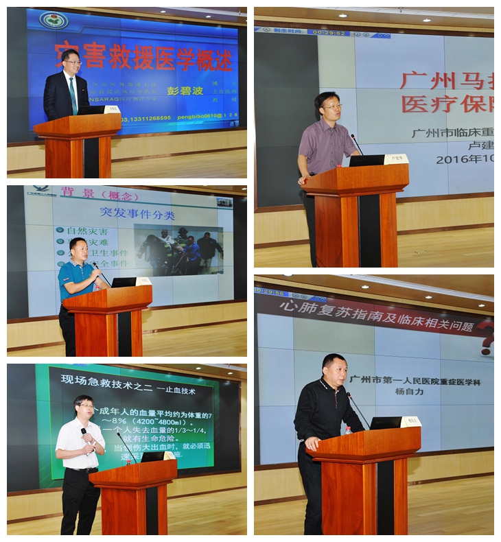 本次培训班武警总医院医务部副主任、中国国际救援队医疗分队长彭碧波教授讲述亲身经历的海外救援事例,深入浅出地为我们详细讲解了EMT的理念和标准。广东省第二人民医院急诊科叶泽兵主任系统地为大家介绍了广东省应急医疗队伍建设的情况,更展望了广东省应急医疗队伍未来的发展。我院急诊科卢建华主任通过讲述广州市马拉松比赛医疗保障工作经历,与参会学员分享了应急救援医疗保障体会。重症医学科杨自力副主任细致解读了最新的心肺复苏指南,对如何更高效地对病人进行急救作了详尽介绍。骨科杨运发副主任通过自己在临床上碰到的生动案例,幽默地为我们讲授了创伤的救治。