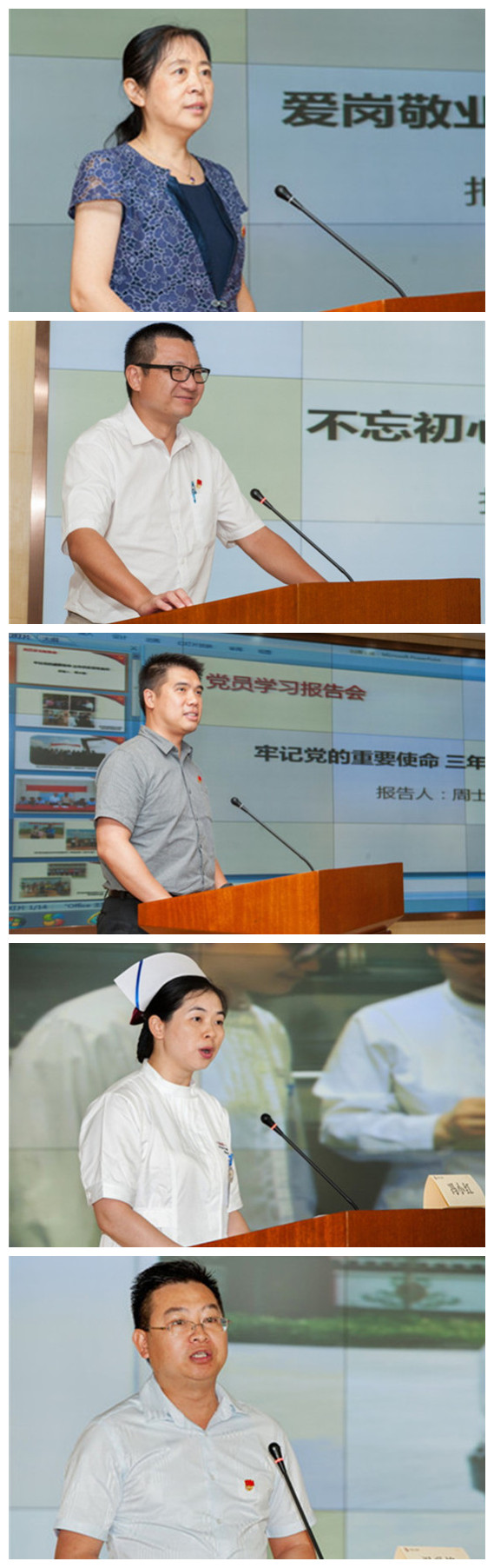 随后,名具有代表性的、来自我院不同岗位、有不同经历的党员,与各位党员同道分享了他们的学习体会。儿科于力同志作《爱岗敬业,做合格共产党员》的学习报告,讲述自己二十多年在儿科扎实工作,心系患者、杜绝私利、廉洁行医的故事;南沙分院蔡维山同志作《不忘初心创业南沙 勇往直前》学习报告,与大家分享在南沙筚路蓝缕、艰难创院的经历,几度热泪盈眶;工会周士臻同志作《牢记党的重要使命 三年扶贫苦炼真功》学习报告,讲述作为扶贫党员干部,三年来在雷州盐田村立足实际,帮助村民修路致富的故事;泌尿外科冯小红同志作《心系患者讲奉献平凡工作有作为》学习报告,讲述作为临床一线护士,如何为病人服务、如何在平凡的岗位上做好工作的学习体会;骨科温世锋同志作《不畏艰苦靠信念 波密帮扶献爱心》学习报告,讲述自己作为援疆援藏代表在西藏帮扶、奉献市一爱心及技术的故事。