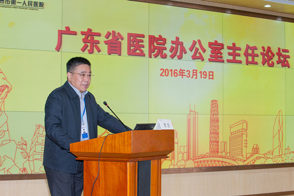 2016年3月19日,我院在英东门诊九楼学术报告厅成功举办第二期广东省医院办公室主任论坛。首届论坛由广东省人民医院举办,本次论坛围绕“执行力”和“品管圈”两个主题,共商医院管理之策,汇聚了省内外数十家医院办公室主任及行政管理人员,二百多人的会场座无虚席,会场气氛热烈。我院院长曹杰,党委副书记、纪委书记贺小伶,副院长聂玉强出席了论坛,办公室主任栗莉主持本次论坛。