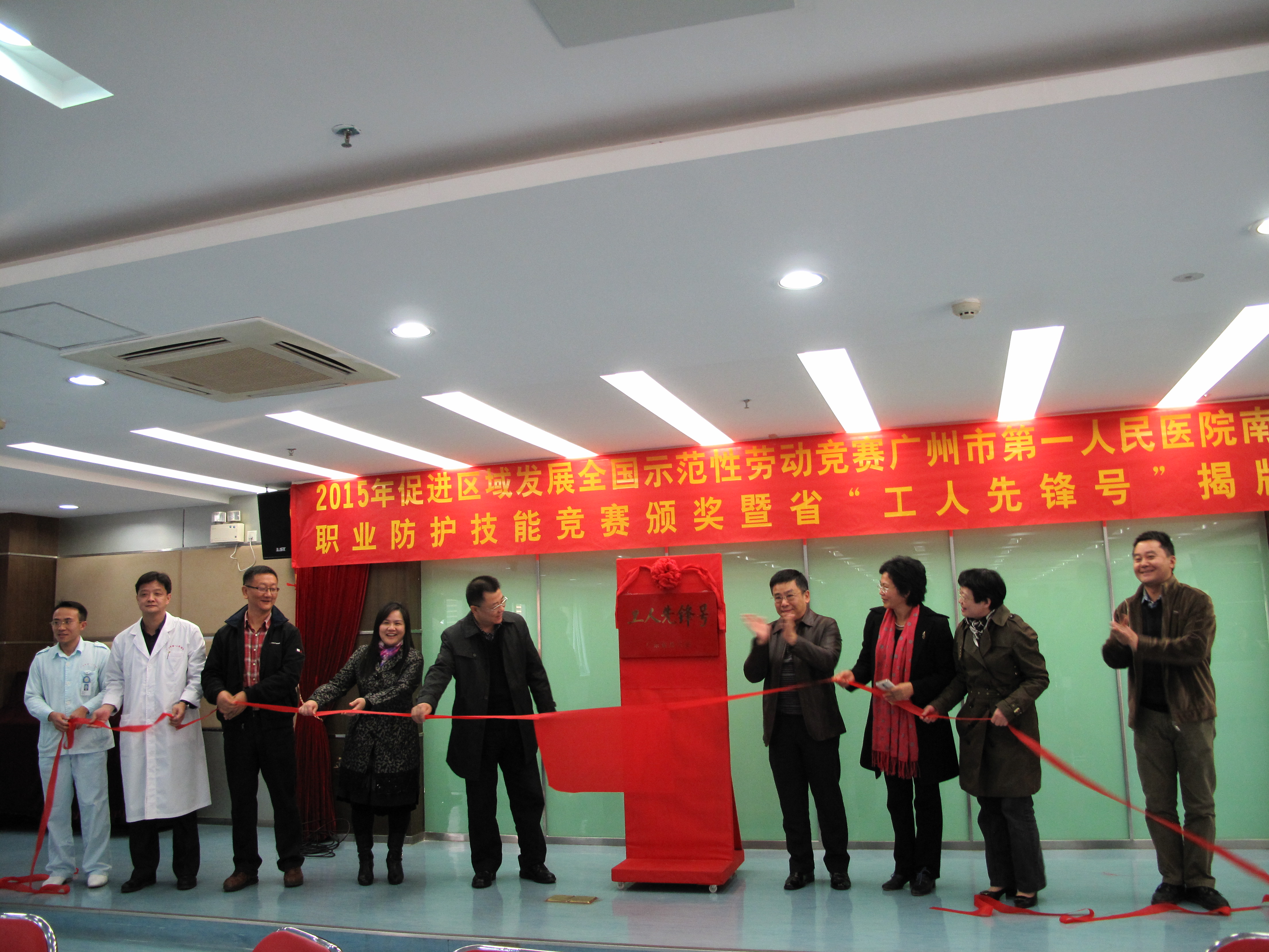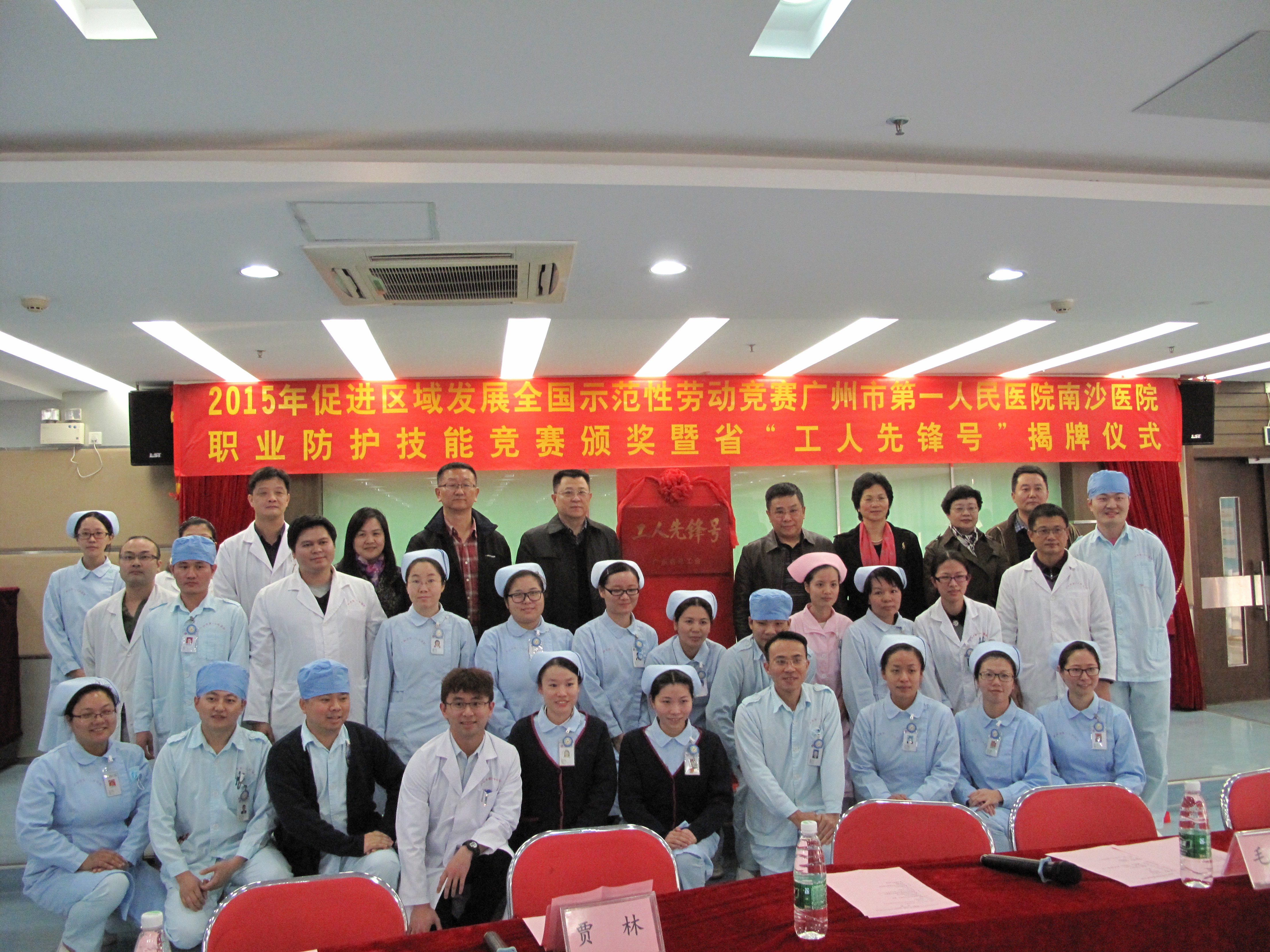 12月18日,我院南沙医院举行了2015年促进区域发展全国示范性劳动竞赛广州市第一人民医院南沙医院职业防护技能竞赛颁奖暨省“工人先锋号”揭牌仪式。南沙区劳动竞赛组委会副主任、南沙区人大常委会副主任、南沙区总工会主席毛鲁泉,南沙区总工会常务副主席梁洁芳,我院曹杰院长、南沙医院全体院领导、工会郭小云主席参加此次颁奖暨揭牌仪式。