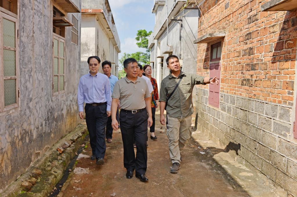 曹杰院长与盐田村干部查看茅草泥砖房改造成果