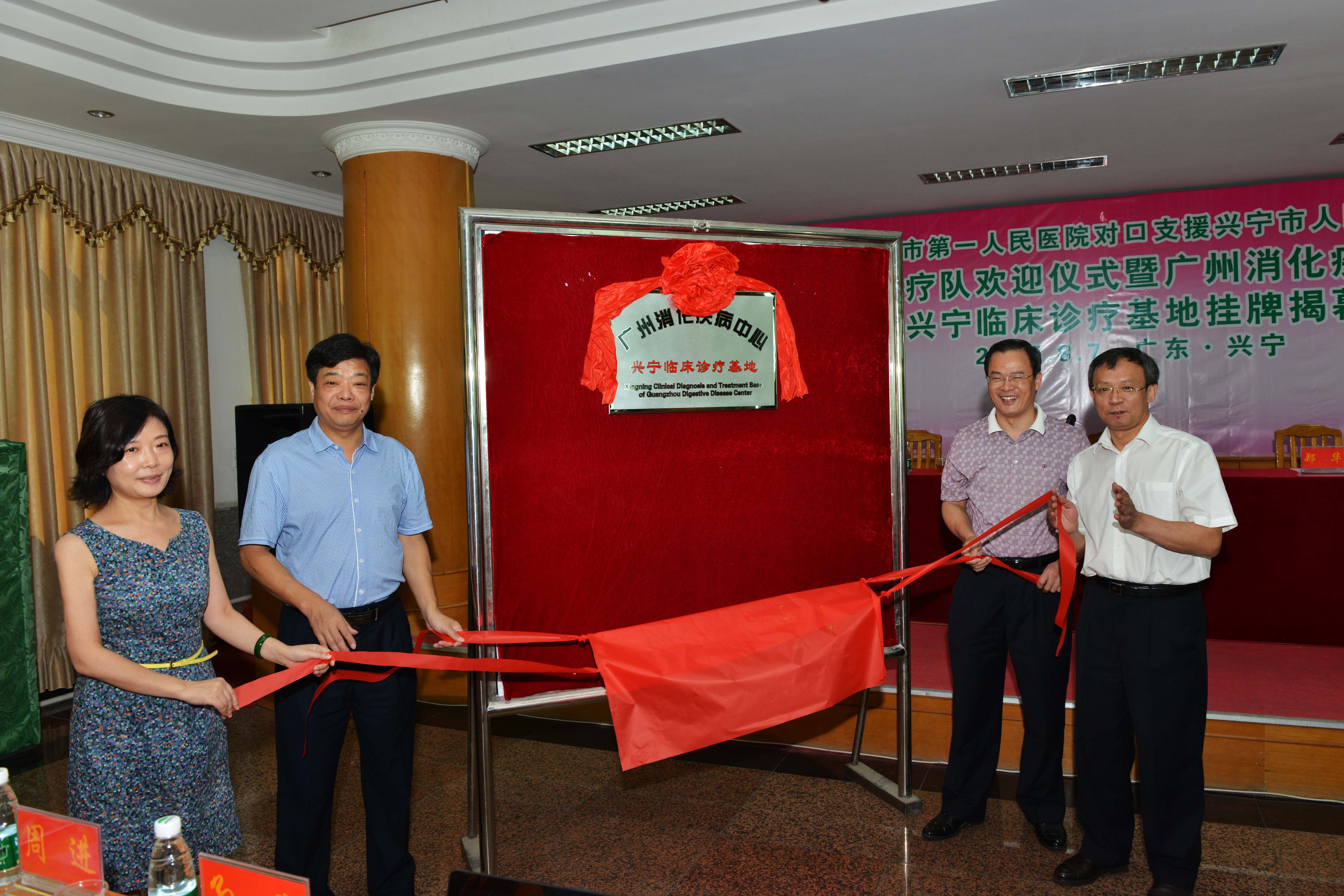 8月6日,医院党委副书记、纪委书记贺小伶,副院长聂玉强带队,医院五个专科青年医生詹琪、林沛茹、陈树达、李宁、龚艳媚以及相关专家组成专业医疗队和部分职能部室负责人一行13人,赴兴宁市人民医院落实为期一年的对口支援工作,同时举行“广州消化疾病中心兴宁临床基地”挂牌仪式。兴宁市人民医院及其上级主管部门,对支医人员的到任高度重视,召开欢迎大会对前来帮扶的专家表示感谢。兴宁市政协副主席郑华、兴宁市卫计局局长练胜红亲自督办支医交接工作。