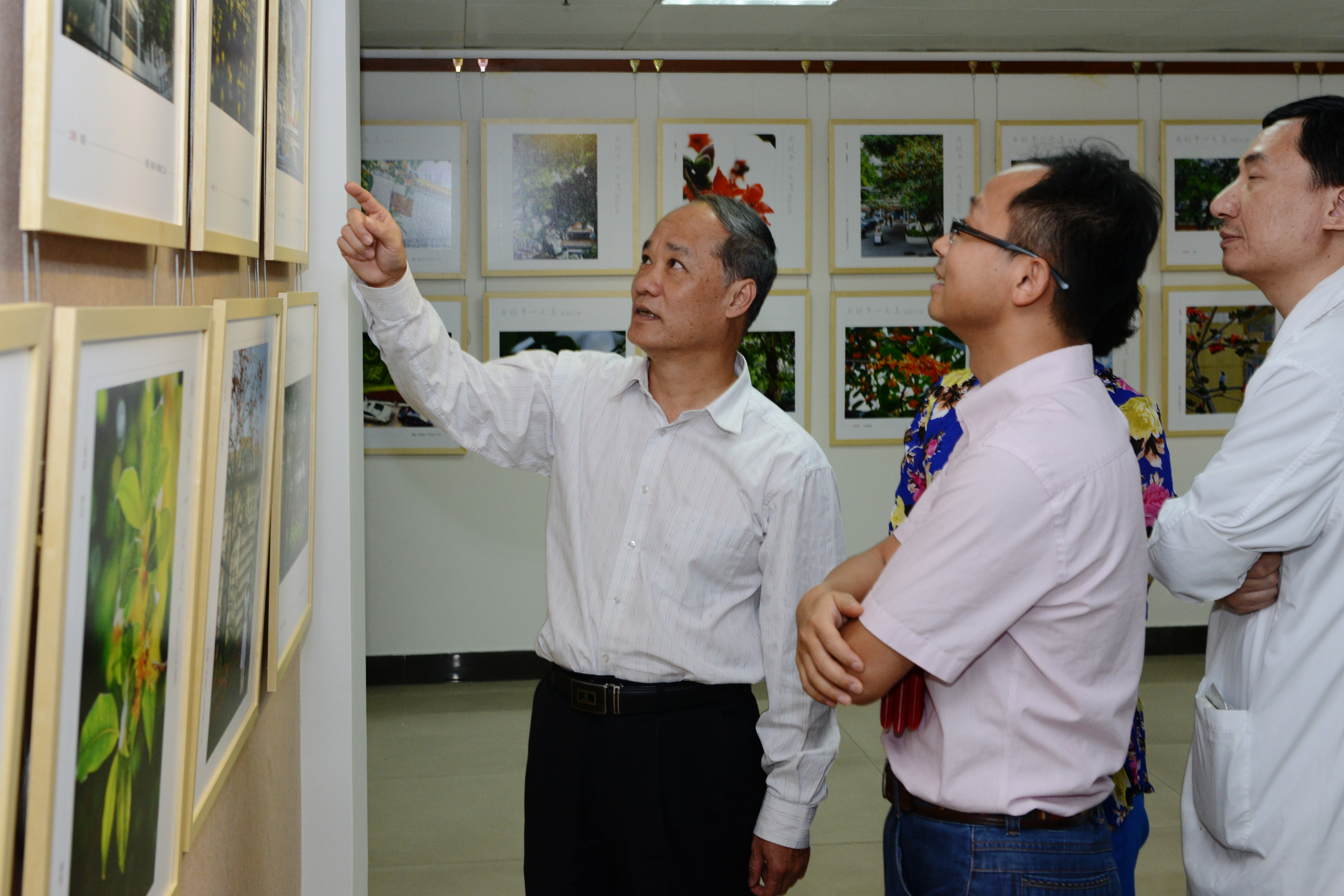 这次展出的30幅获奖作品的放大制作,是医院影协工作人员经过精心选择对比,特意交由省内权威的专业影像输出单位完成的,经过如此精心打造的展品,整齐地悬挂在书画室洁白的墙上,散发出强烈的艺术感染力。参加开幕式的领导和同事们难得从一天忙碌的工作中抽身出来、处身于这种艺术渲染的轻松氛围中,个个一边兴高采烈地热情交流,一边仔细地欣赏佳作,有的人还不时在心仪的作品前拍照。观展过程中,蒋少艾书记逐一向获奖者询问其作品的创作技巧和思路,潘亮副会长也从旁一一分析、解说。大家围在旁边虚心聆听,不时听到有人感叹:“我也拍了这棵榕树,怎么就没发现这个好角度呢。”“原来我院的桂花这么美啊!”、“这木棉拍得真有质感哦,我要好好练习、提高技巧,下一次比赛我也要来发现市一之美……” 开幕式变成了一场精彩的摄影赏析交流课,大家听得津津有味、深受启发。