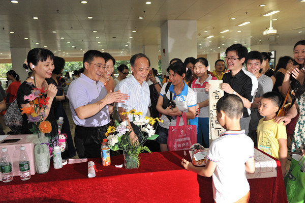 本次“大手牵小手大善暖市一”活动现场设爱心义卖区、文艺表演区、手工艺作品现场教学制作区、“发现市一之美”市一摄影比赛优秀作品展区,汇聚了大、小朋友一起提前欢度“六一”。爱心义卖活动,由医院社工部组织青年志愿者们早早布置好现场。义卖品汇集众爱心人士的义卖品,有书籍、手工口金包、公仔、玩具、新衣物等,护士姐姐现场教小朋友捏橡皮泥、折纸,此外,现场表演区,由职工子女单独或与父母联合进行才艺表演。小朋友们同在一片蓝天下,你方唱罢我登场,尽展快乐容颜。有妈妈笑着说:“这俨然是一条繁荣的商业街。”