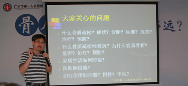 本次骨质疏松防治知识宣讲活动在我院医务部黄逸辉主任、科教信息部包品红主任的欢迎词中展开了序幕。由创伤骨科主任杨运发、肖学军、邝炯祥主任医师,戈涛、王建炜副主任医师和张成娟护士长分别对当前广州地区老年人骨质疏松的危害、预防、药物治疗、手术治疗,以及再骨折、防跌倒的等多方面进行深入浅出的讲解。随后对参会的100多位市民进行免费骨密度测定,并针对测定结果提供一对一的咨询服务,取得了良好的效果。
