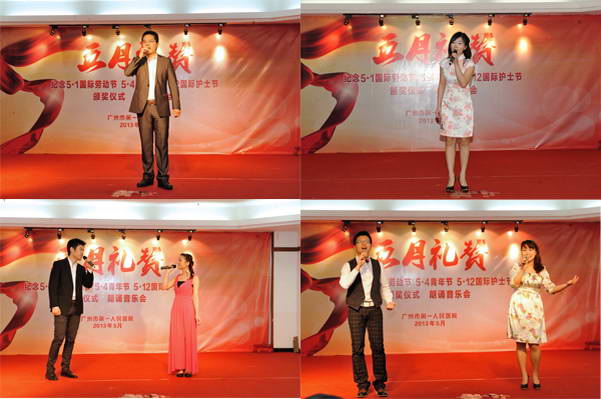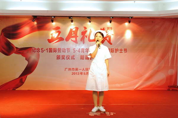 为纪念五一国际劳动节、五四青年节和五一二国际护士节,医院工会、团委、护理部于4月-5月联合开展了“五月礼赞”系列活动。护理部、工会主办了“抗非精神励我前行”演讲比赛(获奖名单后附),选拔出优胜者参加了市卫生局演讲比赛;团委、工会主办了“我的中国梦”原创诗歌、散文作品征集(获奖名单后附),成立评审组对征集到的作品进行认真、细致地评审。5月10日下午, 三个部门联合举办了纪念五一国际劳动节、五四青年节和五一二国际护士节颁奖仪式暨朗诵音乐会,全体在院领导、部分党总支(支部)书记、获奖代表、护士代 表、部门工会代表和青年代表参加了会议。大会分两部分进行,第一部分是颁奖仪式,院领导分批为工会、共青团、护理部近期推荐并获得省、市、局相关奖项、院 内评选奖项的先进集体和个人,以及演讲比赛和征文比赛获奖者进行了颁奖。蒋少艾书记在颁奖仪式后讲话,对获表彰集体和个人予以充分肯定,并号召全院职工学习先进、争当先进,展现“市一人”的精神风貌和价值追求。第 二部分是朗诵音乐会,“抗非精神励我前行”演讲比赛一等奖获得者现场进行表演;我院职工和青年艺术团成员朗诵了《芳心予人》、《我的中国梦》、《行走在梦 的路上》等职工原创诗歌、散文优秀作品;青年艺术团成员演唱了歌曲,整场朗诵音乐会内容充实、表现形式多样,得到了广大职工的好评。