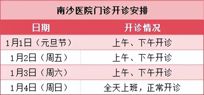 南沙医院门诊开诊时间:中心注射室抽血1月1日-3日正常服务,X线、CT平扫1月1日-3日正常服务,MR1月1日正常服务,心电图室1月3日上午正常服务。