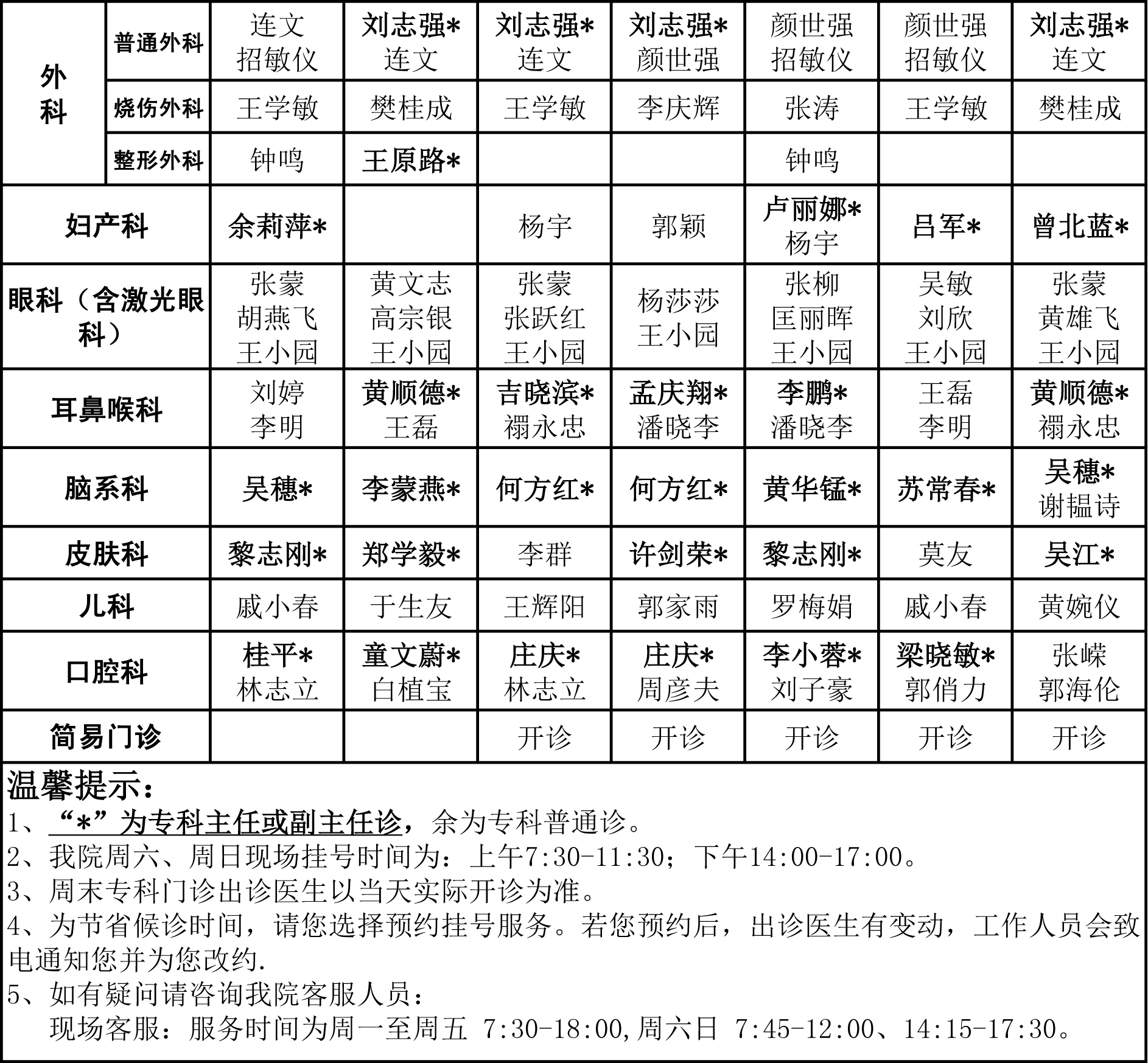 2016年国庆节专科门诊排班表