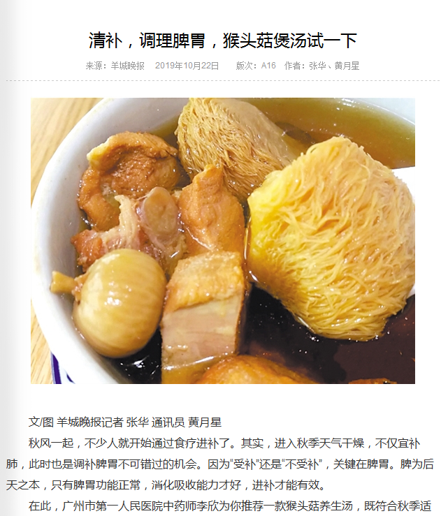 《羊城晚报》清补,调理脾胃,猴头菇煲汤试一下2019年10月22日A16版