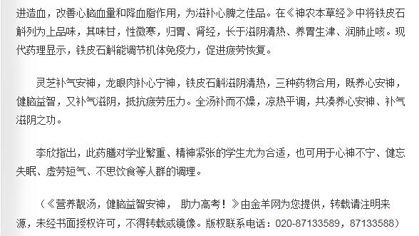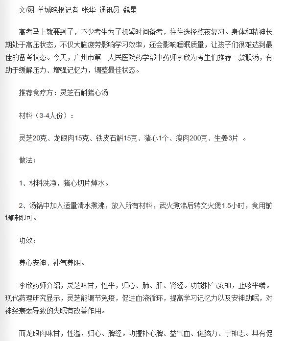 《羊城晚报》;营养靓汤,健脑益智安神, 助力高考! 20149年6月4日A16版