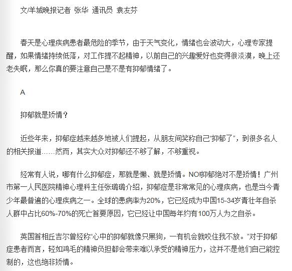 《羊城晚报》:不开心、没兴趣 你是不是抑郁了? 2019年4月2日A14版