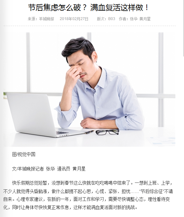 《羊城晚报》:节后焦虑怎么破? 满血复活这样做!2018年2月27日B03版