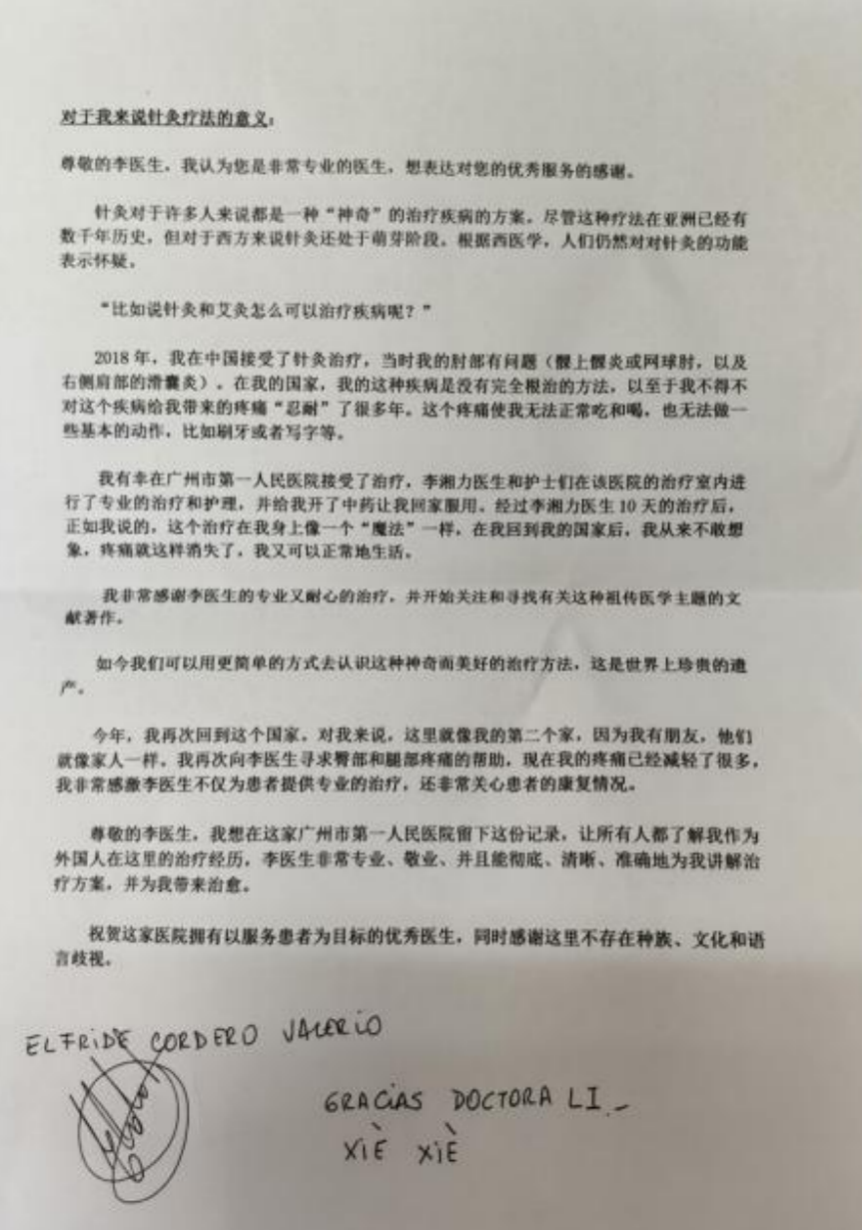 11月8日,广州市第一人民医院中医科主任医师李湘力收到了一封来自智利患者埃尔菲(Elf)的信件,字里行间满载着她对中医技术的赞叹与对医生的感激之情。