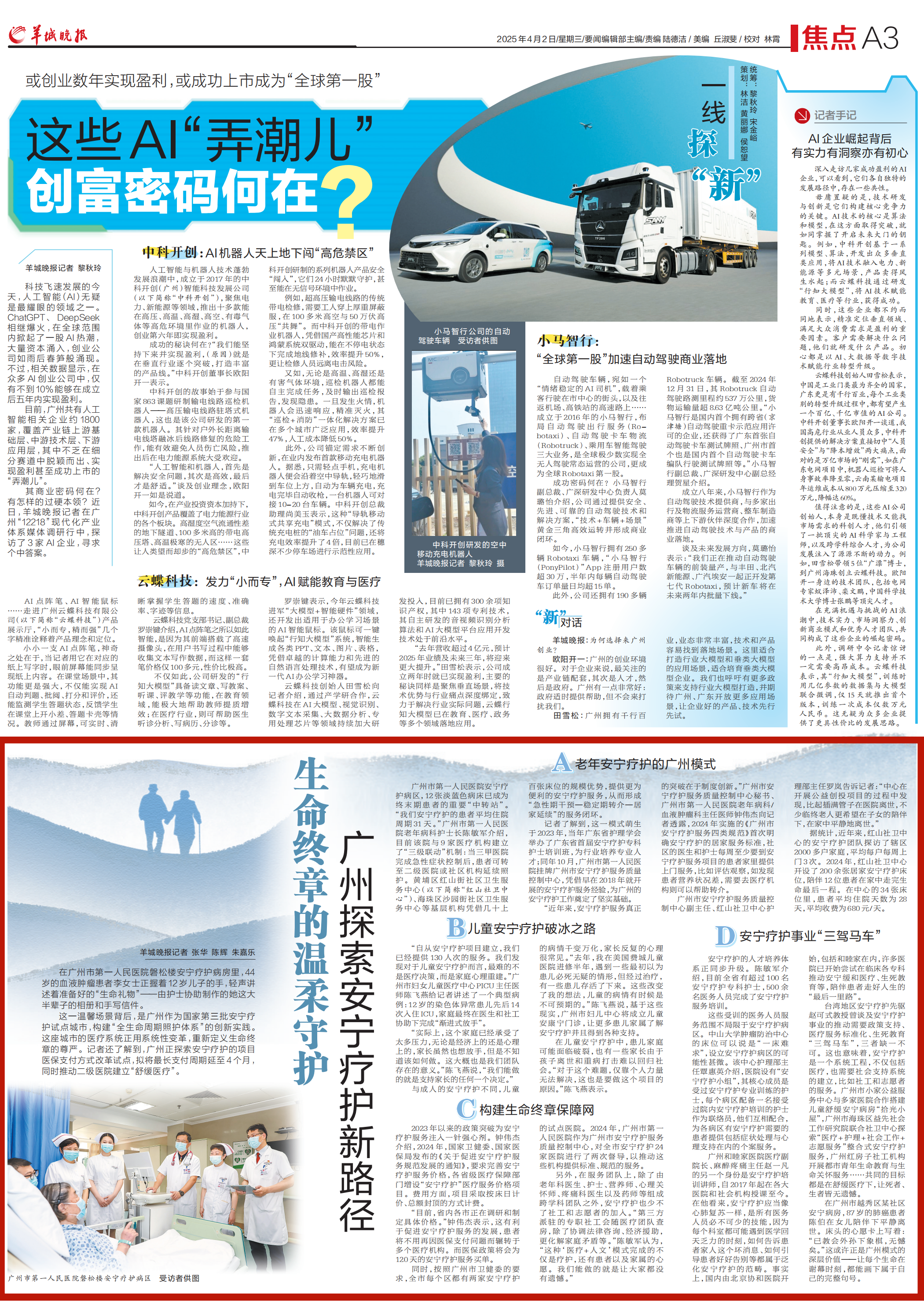 “近年来,安宁疗护服务真正的突破在于制度创新。”广州市安宁疗护服务质量控制中心秘书、广州市第一人民医院老年病科/血液肿瘤科主任医师钟伟杰向记者透露,2024年实施的《广州市安宁疗护服务四类规范》首次明确安宁疗护的居家服务标准,社区的医生和护士每周至少要到安宁疗护服务项目的患者家里提供上门服务,比如评估观察,如发现患者营养状况差,需要去医疗机构则可以帮助转介。