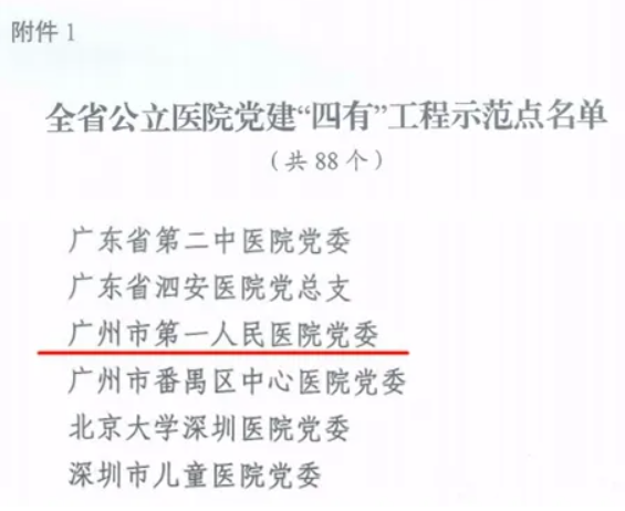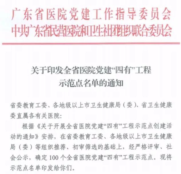 近日,广东省医院党建工作指导委员会、省民营医院和卫生社团组织联合党委公布全省医院党建“四有”工程示范点名单,广州市第一人民医院党委获评全省医院党建“四有”工程示范点。