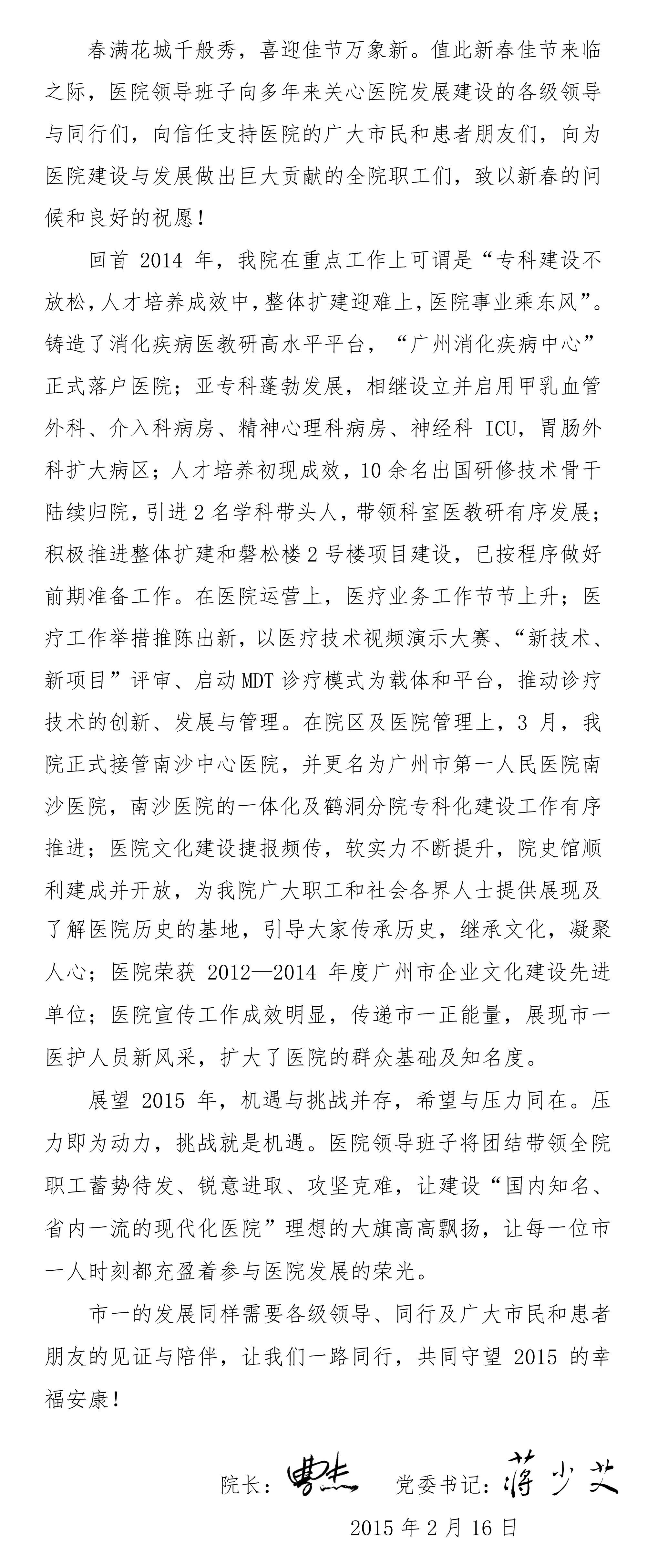 凝心聚力谋发展 百舸争流竞远航——2015春节致辞