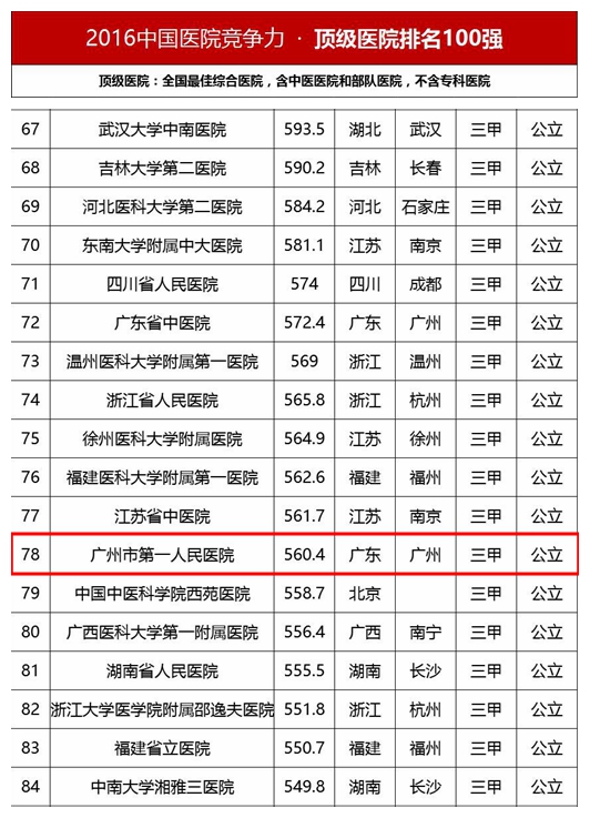 2017年3月25日,在由香港艾力彼医院管理研究中心在广州举行的2016中国医院竞争力排行榜发布仪式上传来喜讯,广州市第一人民医院排名“2016中国医院竞争力·顶级医院100强”榜单第78位,较2015年上升一位,并连续两年蝉...