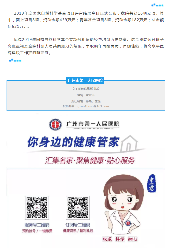 【喜报】刷新纪录!市一医院获批2019年度国家自然科学基金立项16项