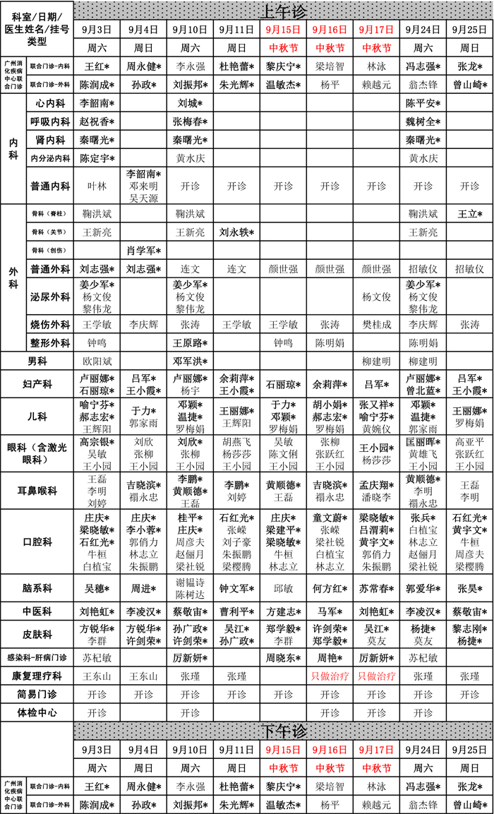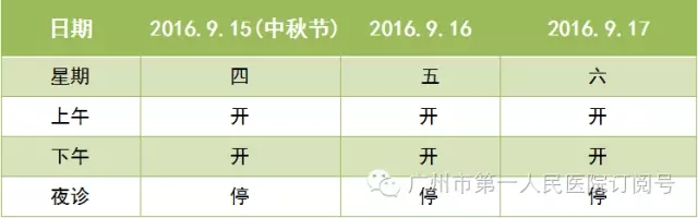 尊敬的先生/女士: 广州市第一人民医院2016年中秋节开诊安排具体如下: 备注 1、门诊9月15日至9月17日按...