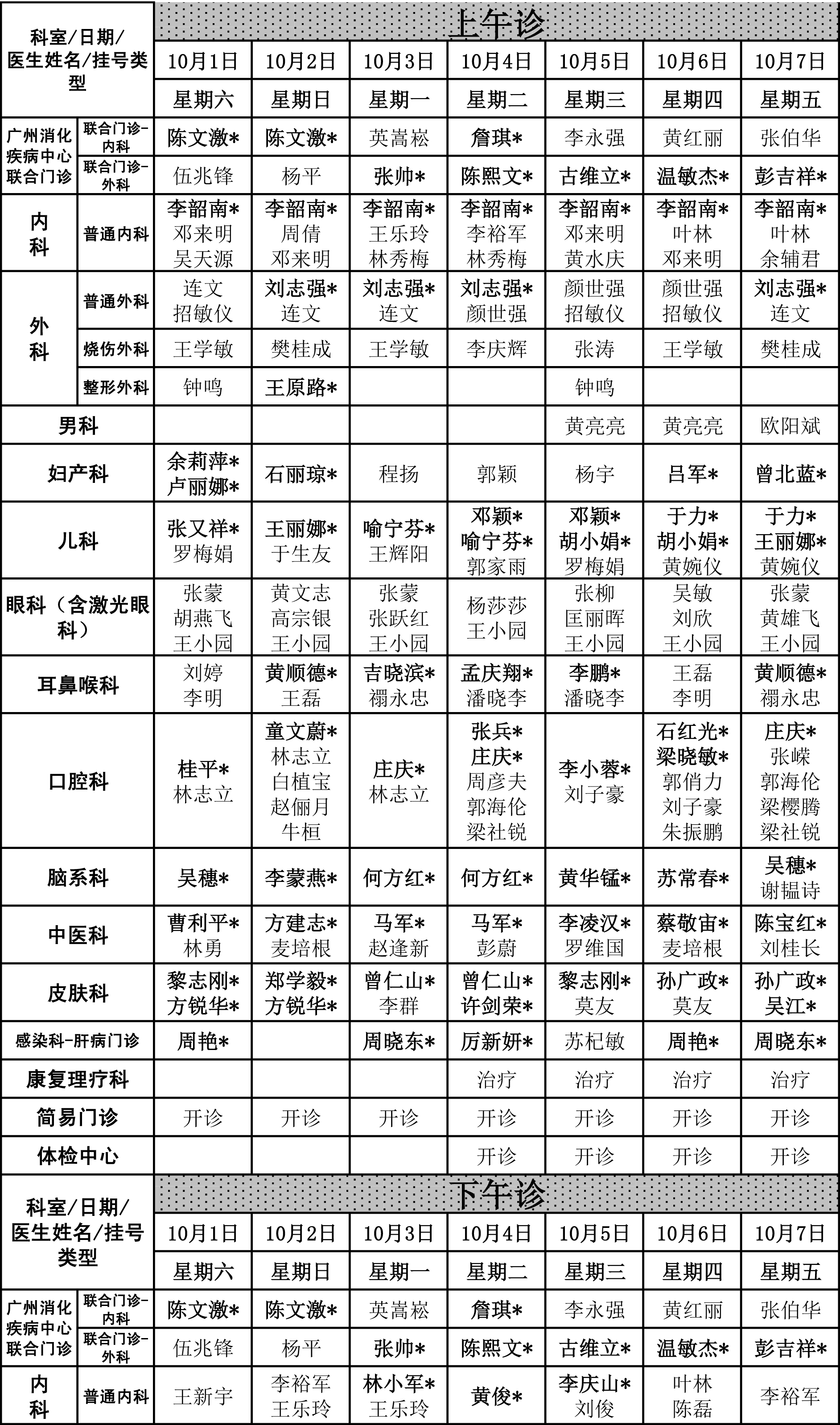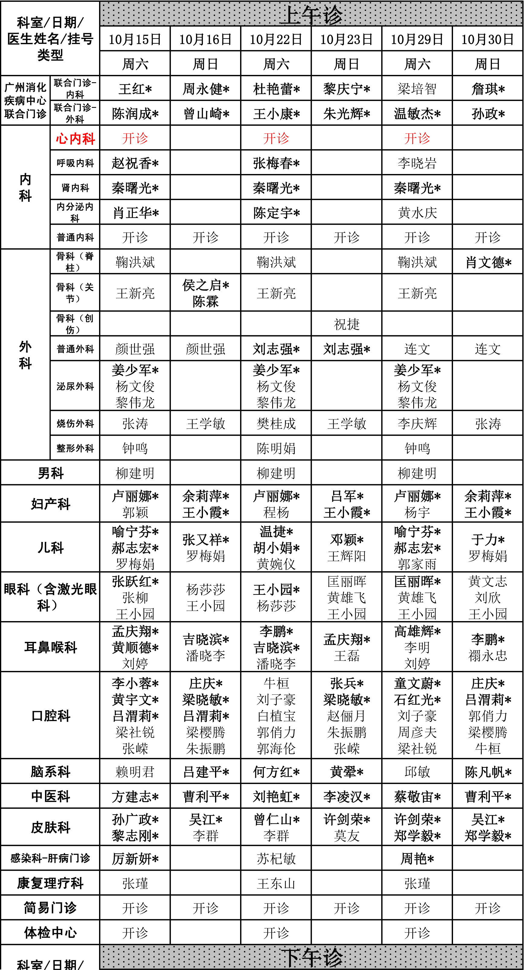 2016年10月周末专科门诊排班表