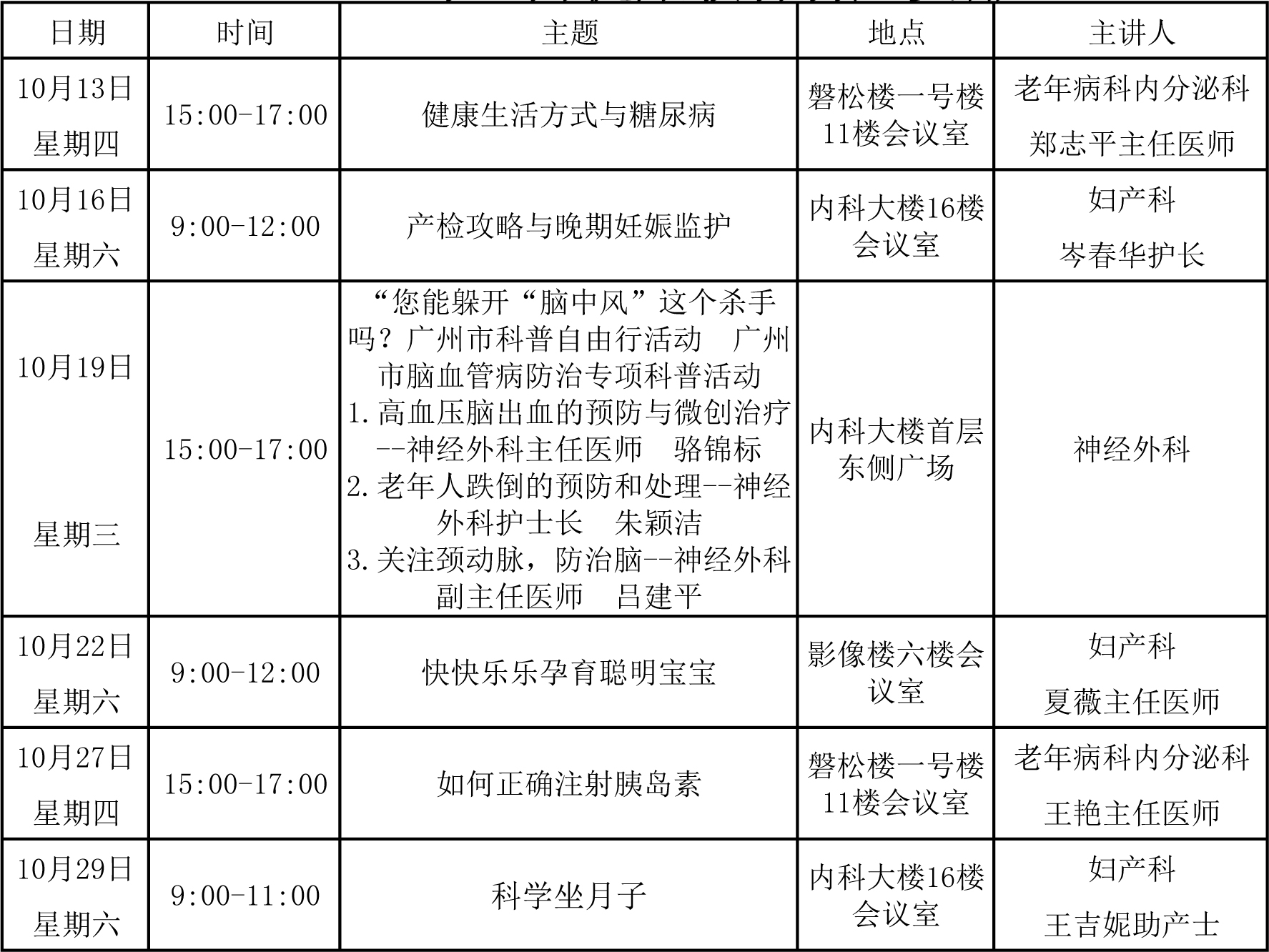 2016年10月健康教育安排