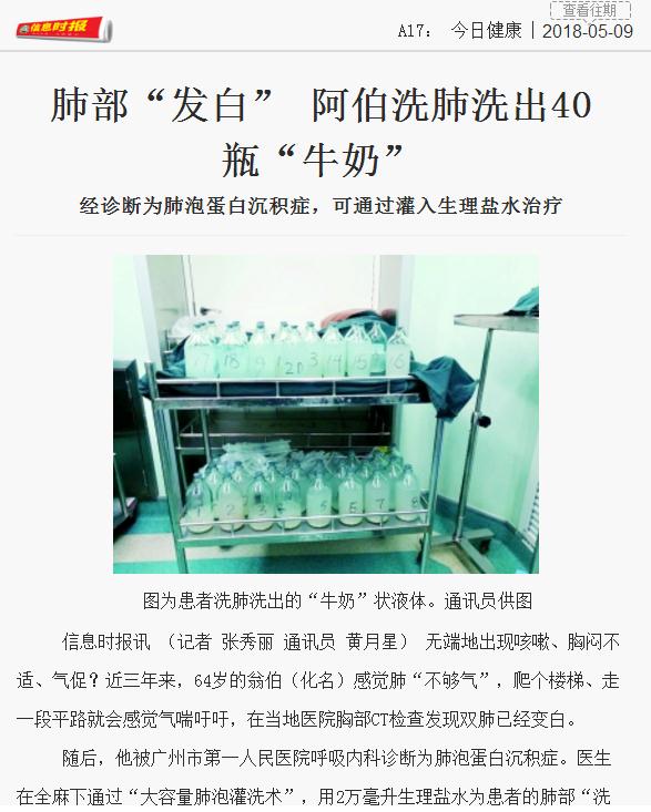 《信息时报》:肺部“发白” 阿伯洗肺洗出40瓶“牛奶” 2018年5月9日A17版