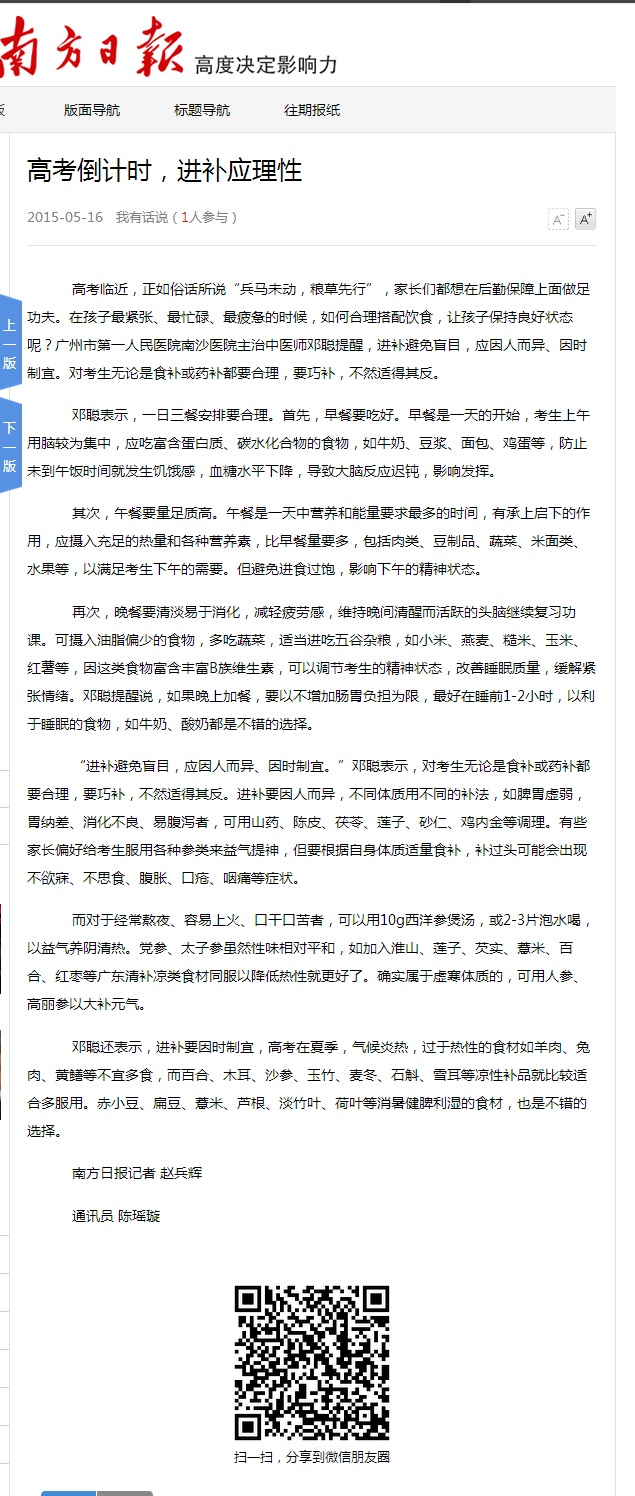 《南方日报》:高考倒计时,进补应理性 2015年5月16日A17版