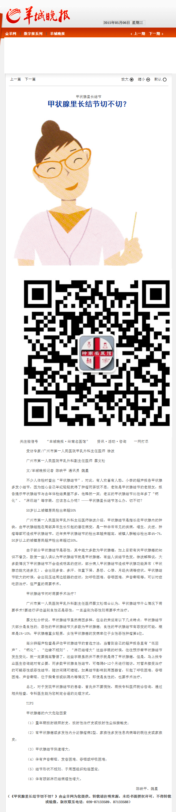《羊城晚报》:甲状腺里长结节切不切? 2015年5月6日B07版