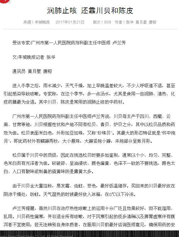 《羊城晚报》:润肺止咳 还靠川贝和陈皮 2017年1月21日A8版