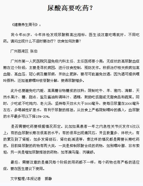《健康养生周刊》:尿酸高要吃药吗?2017年1月24日A04版