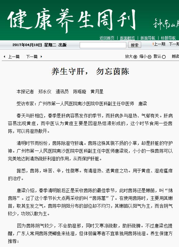 《健康养生周刊》:养生守肝,勿忘茵陈 2017年4月18日A06版