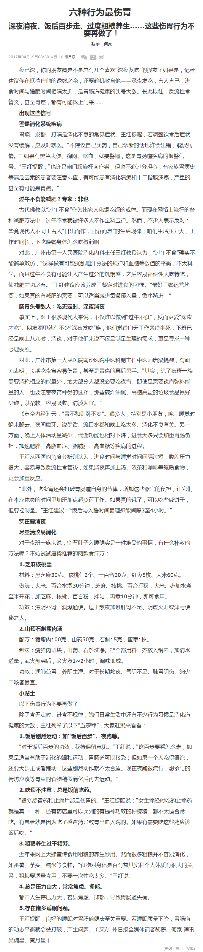 《广州日报》:六种行为最伤胃 2017年4月19日A12版