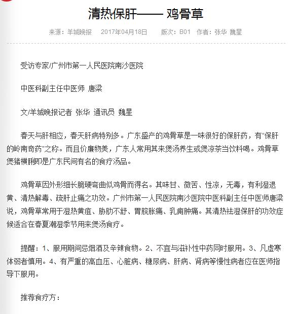 《广州日报》:春夏潮湿季鸡骨草煲汤可保肝护肝 2017年4月10日A14版