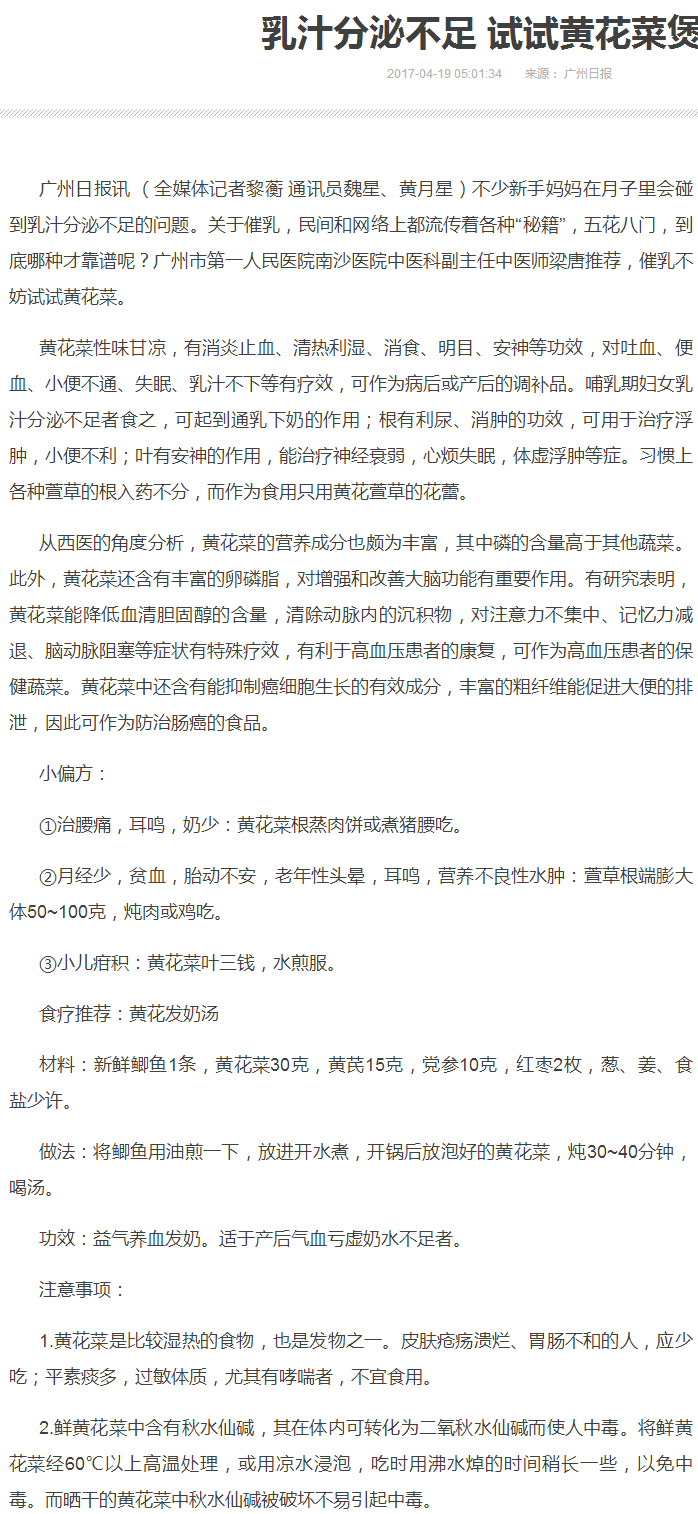 《广州日报》:乳汁分泌不足 试试黄花菜煲汤 2017年4月19日A12版