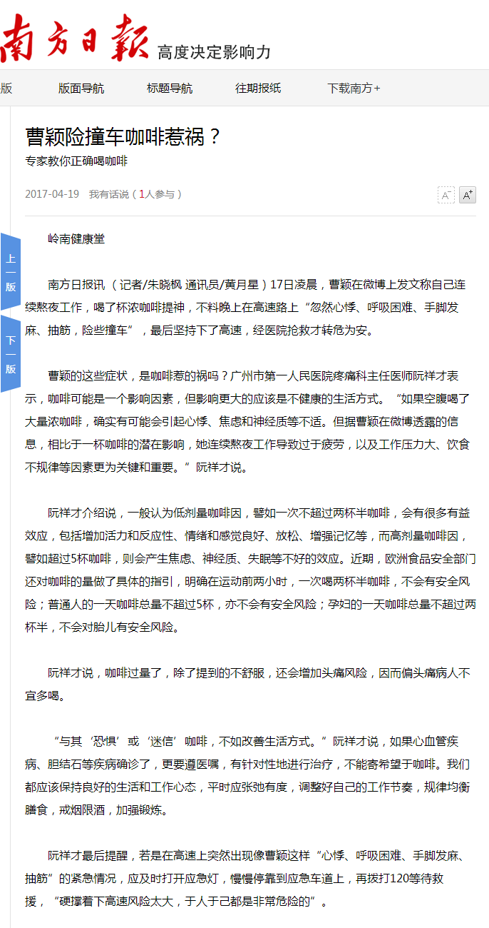《南方日报》:曹颖险撞车 咖啡惹祸?专家教你正确喝咖啡 2017年4月19日A11版
