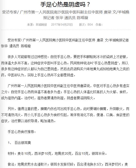 《羊城晚报》:手足心热是阴虚吗?2017年4月25日B04版