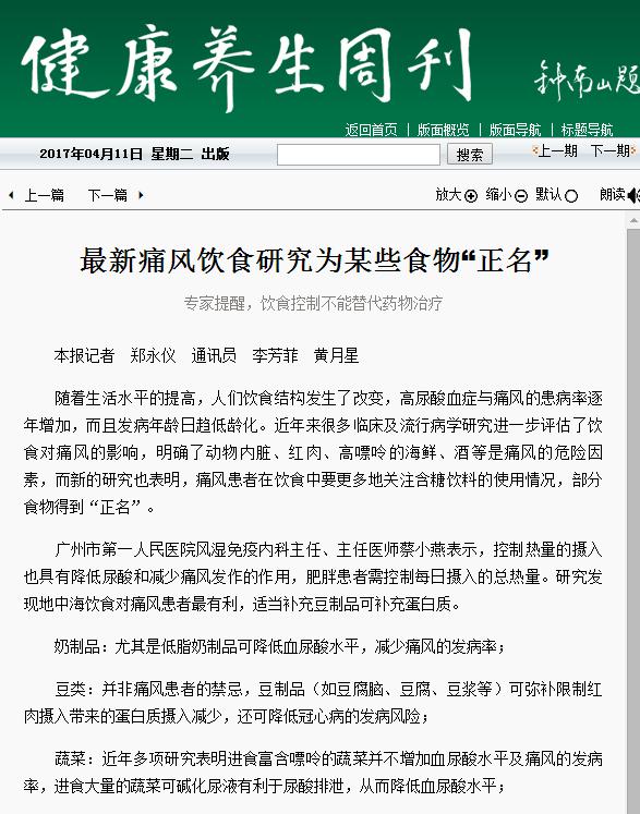 《健康养生周刊》:最新痛风饮食研究为某些食物“正名”2017年4月11日B03版